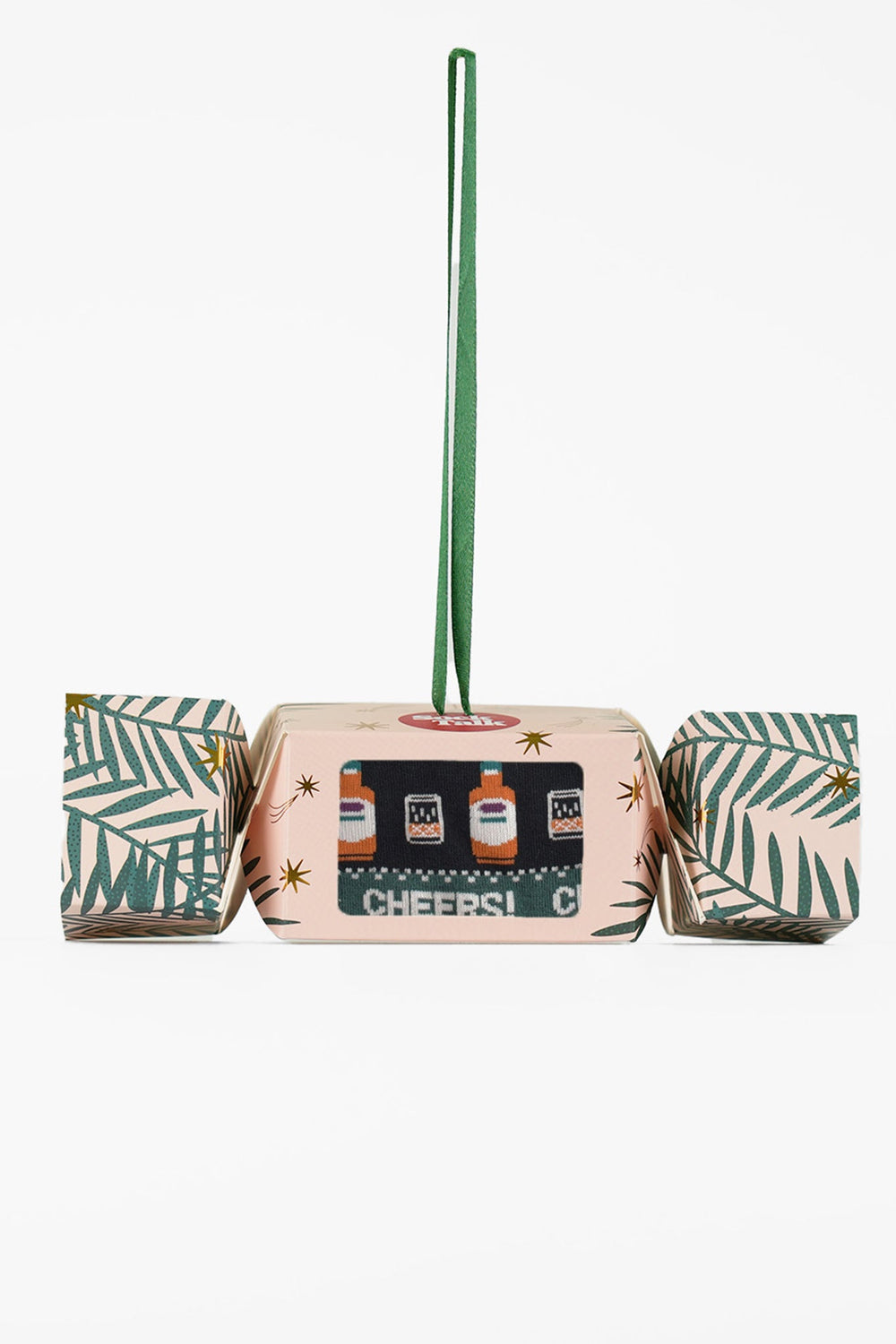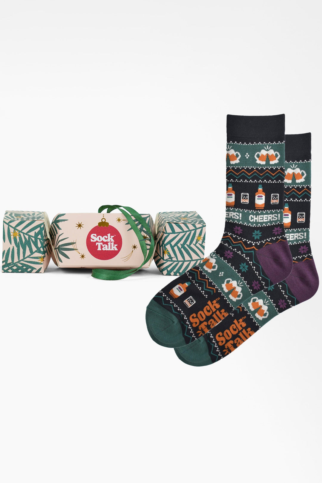 Men's Bamboo Crew Socks Christmas Cracker Gift Box - Black/Green, Party Drinks Fair Isle