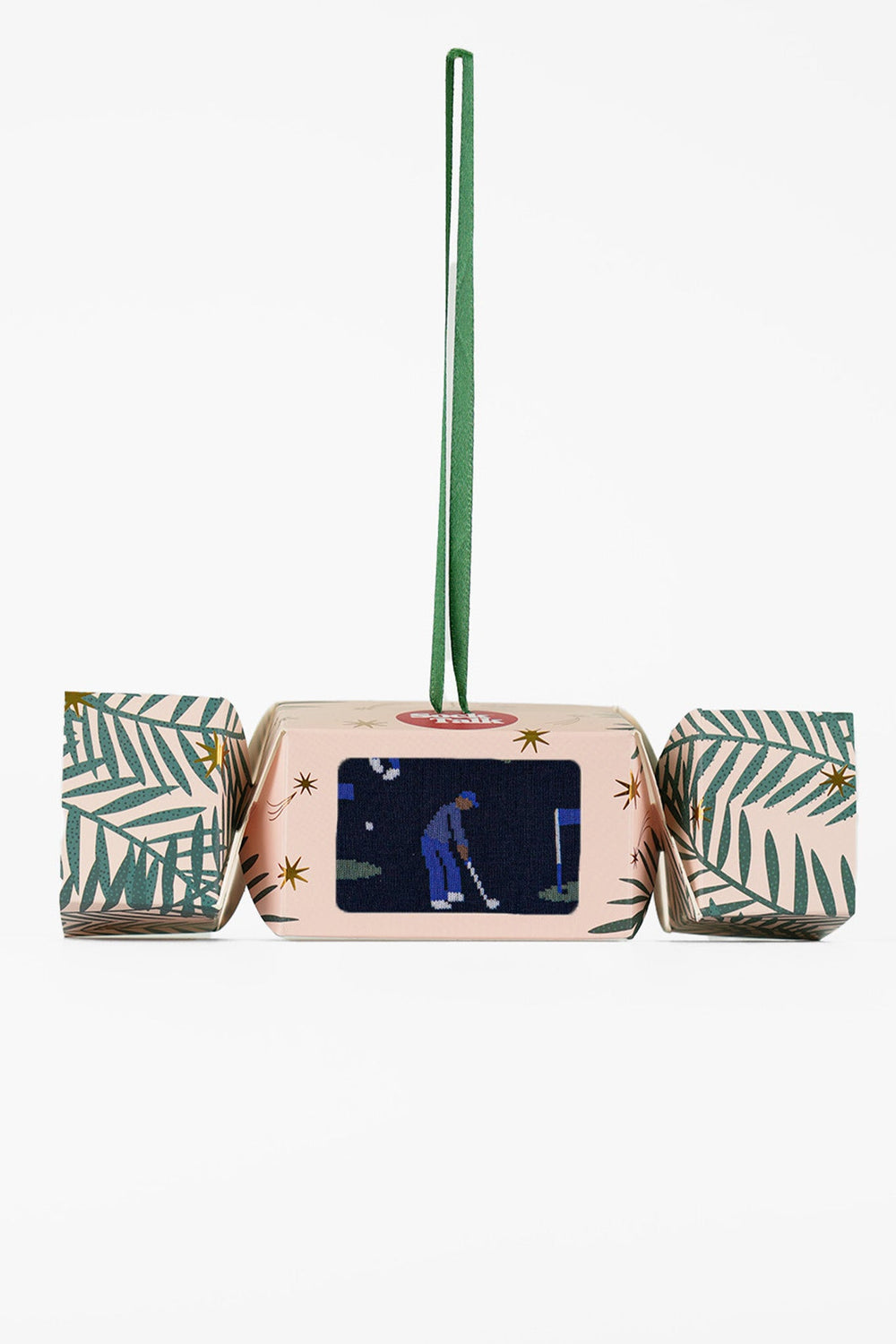 Men's Bamboo Crew Socks Christmas Cracker Gift Box - Navy Blue/Denim Blue, Golfer and Trees