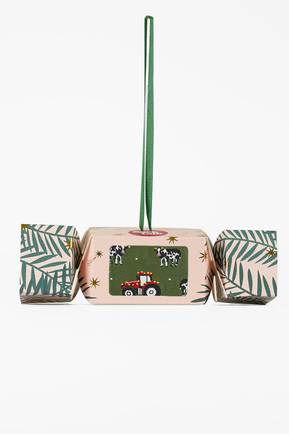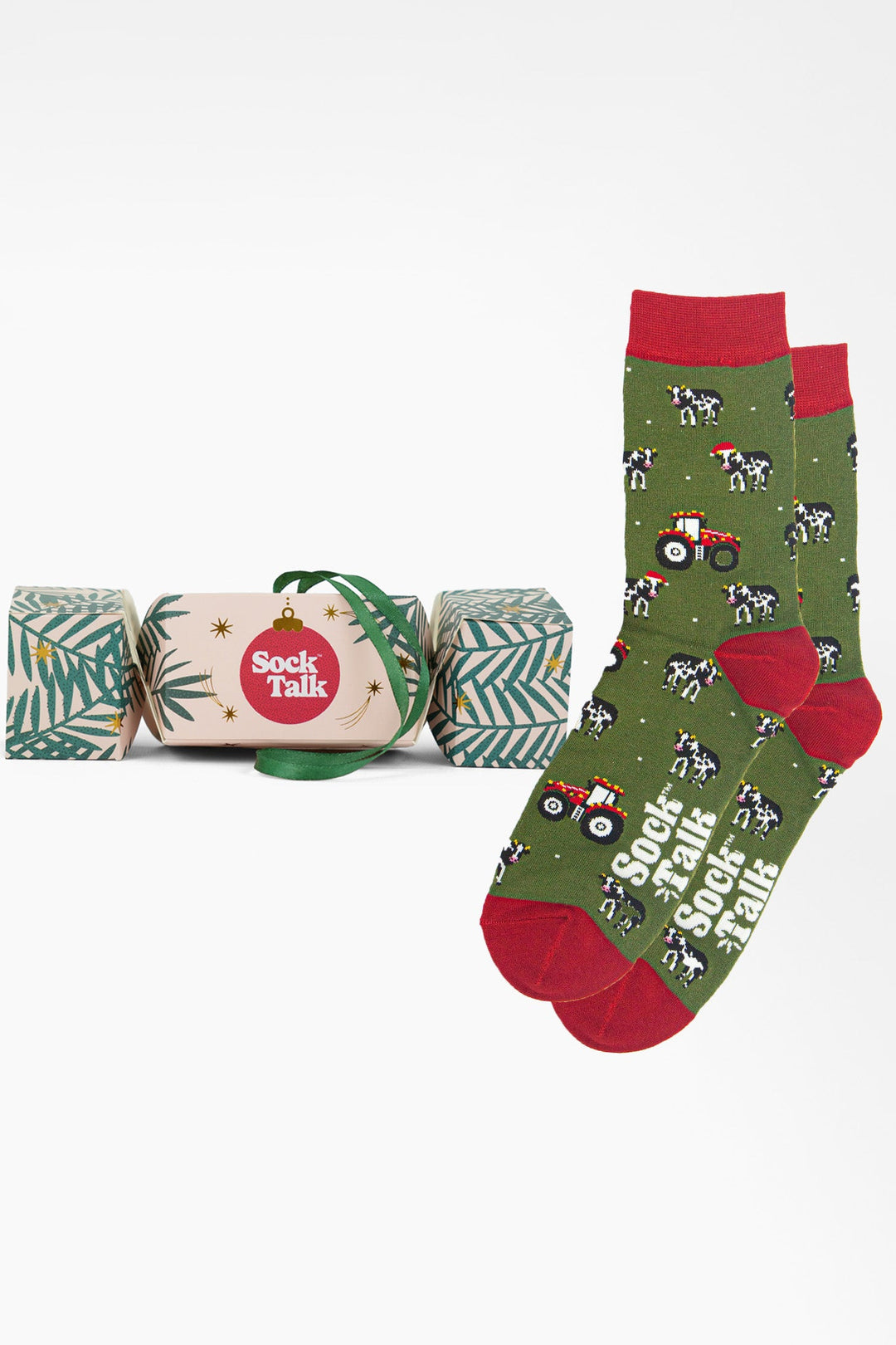 Men's Bamboo Crew Socks Christmas Cracker Gift Box - Green/Red, Christmas Cow and Tractor