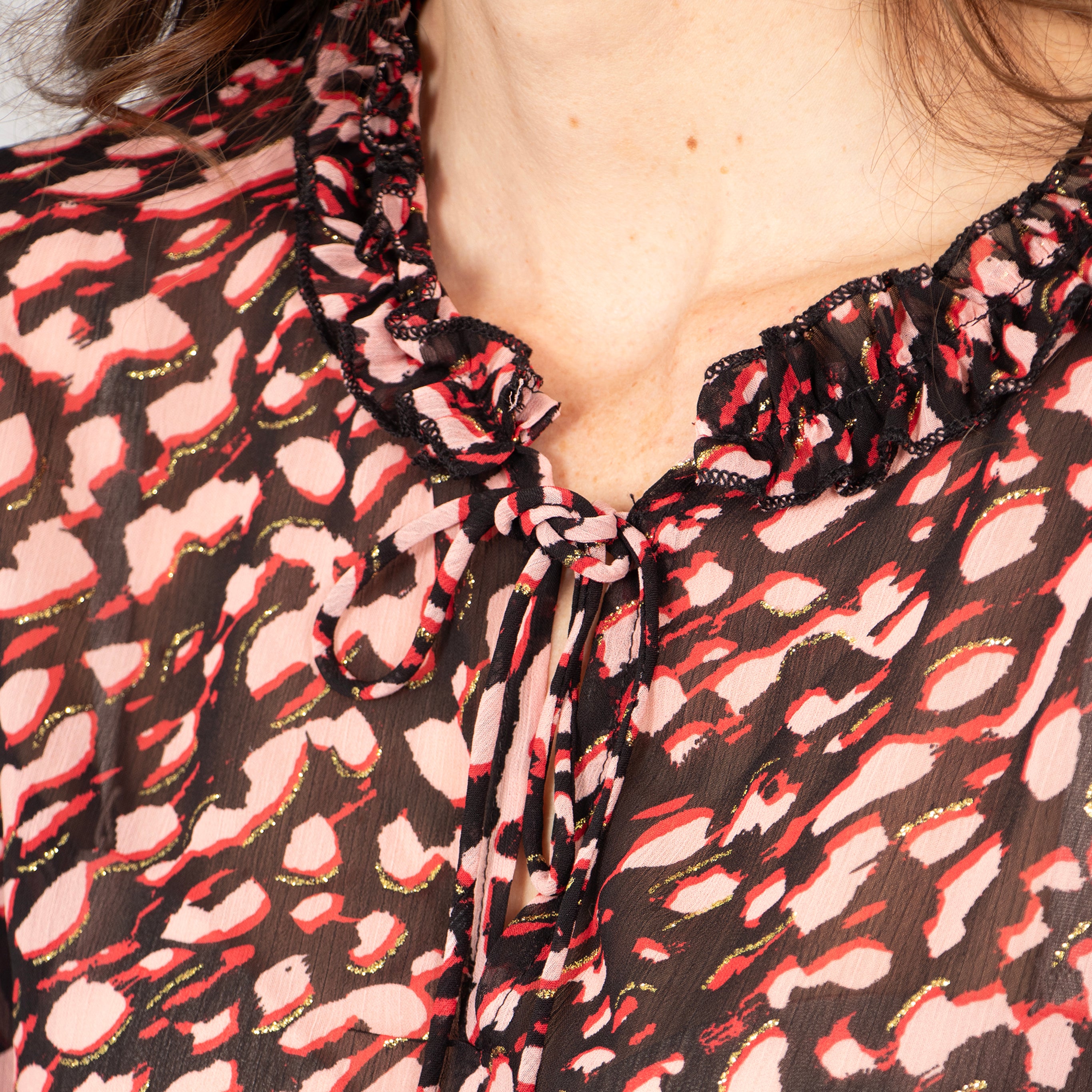 model wearing a long sleeve pink leopard print blouse with gold metallic highlights, the blouse has long sleeves and a ruffles grandad collar